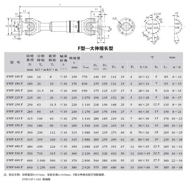 萬向聯軸器的共同特點是角向補償量較大,不同結構型式萬向聯軸器兩軸線夾角不相同,一般≤5°-45°之間。萬向聯軸器利用其機構的特點,使兩軸不在同一軸線,存在軸線夾角的情況下能實現所聯接的兩軸連續回轉,并可靠地傳遞轉矩和運動。萬向聯軸器最大的特點是具有較大的角向補償能力,結構緊湊,傳動效率高。SWC型、SWP型十字軸式萬向聯軸器是一種最常用的聯軸器。利用其結構的特點能使不在同一軸線或軸線折角較大或軸向移動較大的兩軸等角速連續回轉,并可靠地傳遞轉矩和運動。能廣泛應用于冶金、起重、工程運輸、礦山、石油、船舶、煤炭、橡膠、造紙機械及其它重機行業的機械軸系中傳遞轉矩。SWC型、SWP型十字軸式萬向聯軸器的主要特點為:1.具有較大的角度補償能力。2.結構緊湊合理。SWC型采用整體式叉頭,使運載更具可靠性。3.承載能力大。與回轉直徑相同的其它型式的聯軸相比較,其所傳遞的扭矩更大,此對回轉直徑受限制的機械設備,其配套范圍更具優越性。4.傳動效率高。其傳動效率達98-99.8%,用于大功率傳動,節能效果明顯。5.運載平穩,噪聲低,裝拆維護方便。